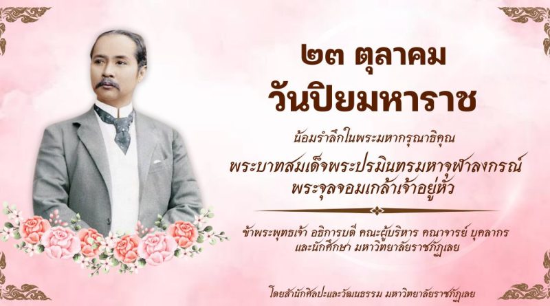 ข่าวประชาสัมพันธ์ ๒๓ ตุลาคม วันปิยมหาราช 23/10/2025 admin ๒๓ ตุลาคม วันปิยมหาราช น้อมรำลึกในพระมหากรุณาธิคุณ พระบาทสมเด็จพระปรมินทรมหาจุฬาลงกรณ์ พระจุลจอมเกล้าเจ้าอยู่หัว ข้าพระพุทธเจ้า อธิการบดี คณะผู้บริหาร คณาจารย์ บุคลากร และนักศึกษา มหาวิทยาลัยราชภัฏเลย โดยสำนักศิลปะและวัฒนธรรม มหาวิทยาลัยราชภัฏเลย Share to...